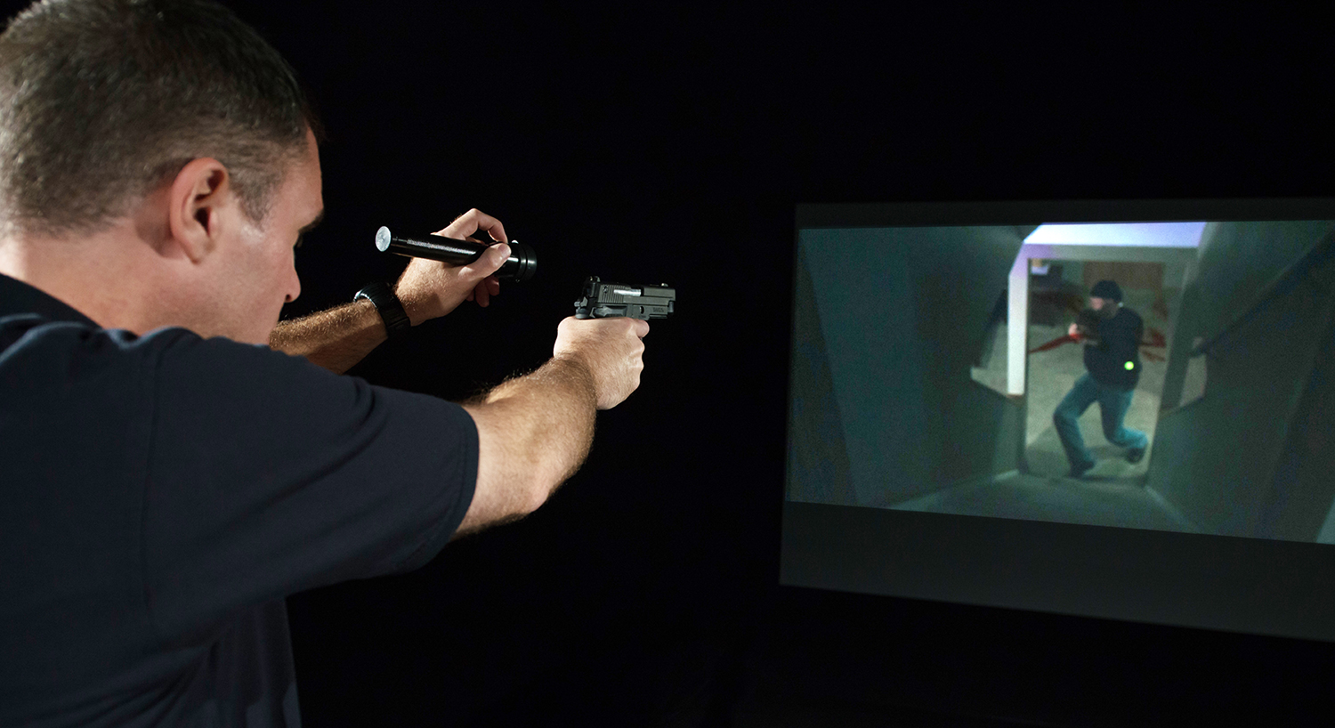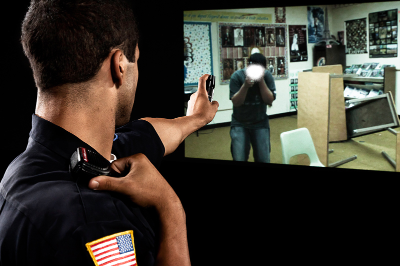 The flashlight option provides increased training value by simulating night training or training in dark areas where a flashlight is required. This allows any video scenario to become a “night scenario” without the time, labor and expense of re-filming the scenario. With the flashlight option, trainees gain experience in managing a firearm and flashlight simultaneously. Multiple flashlights can be used concurrently when training in groups.